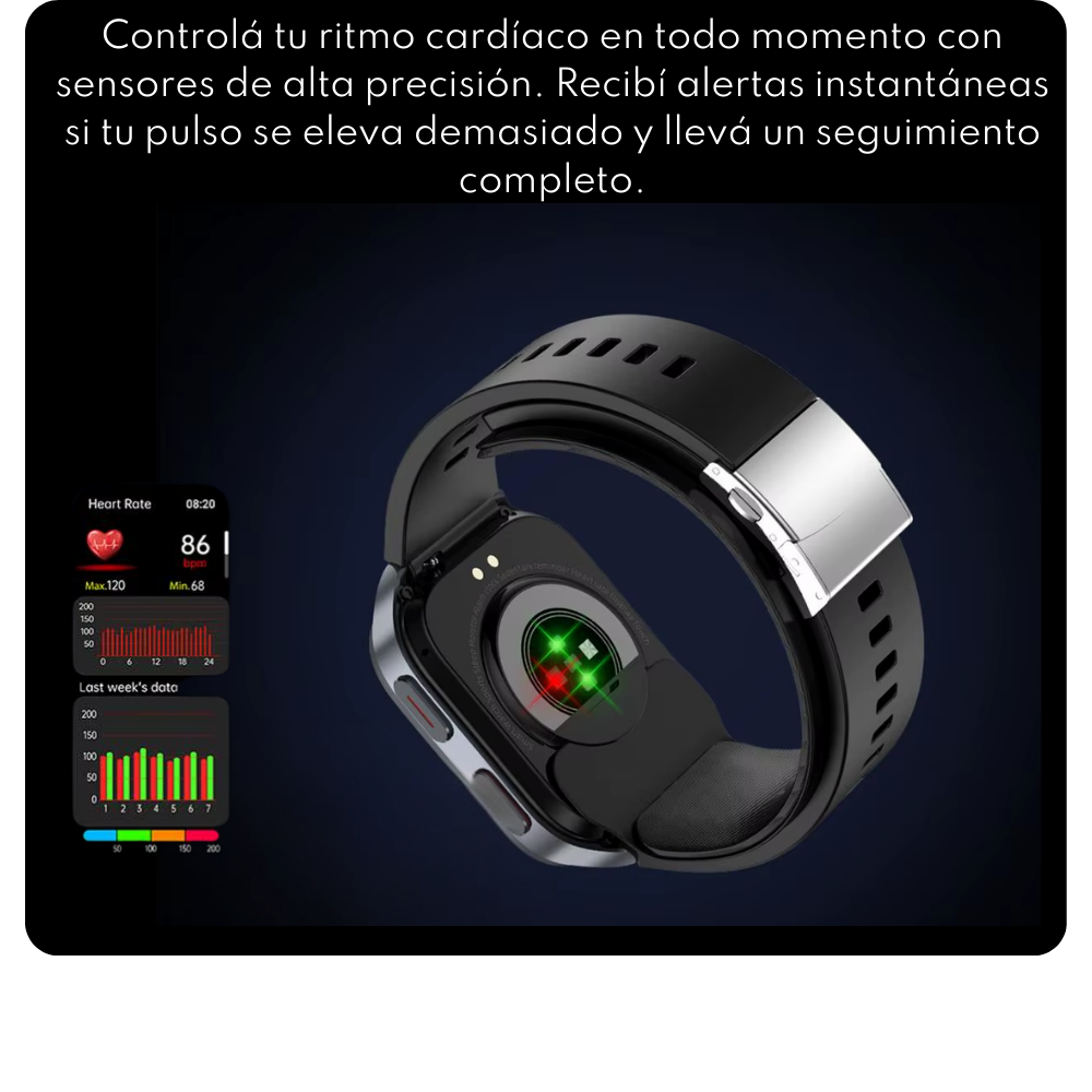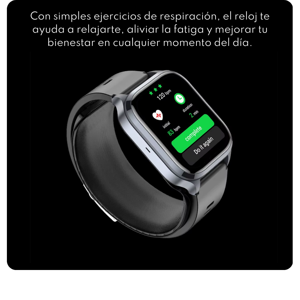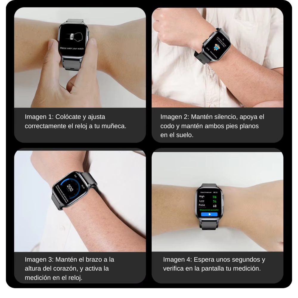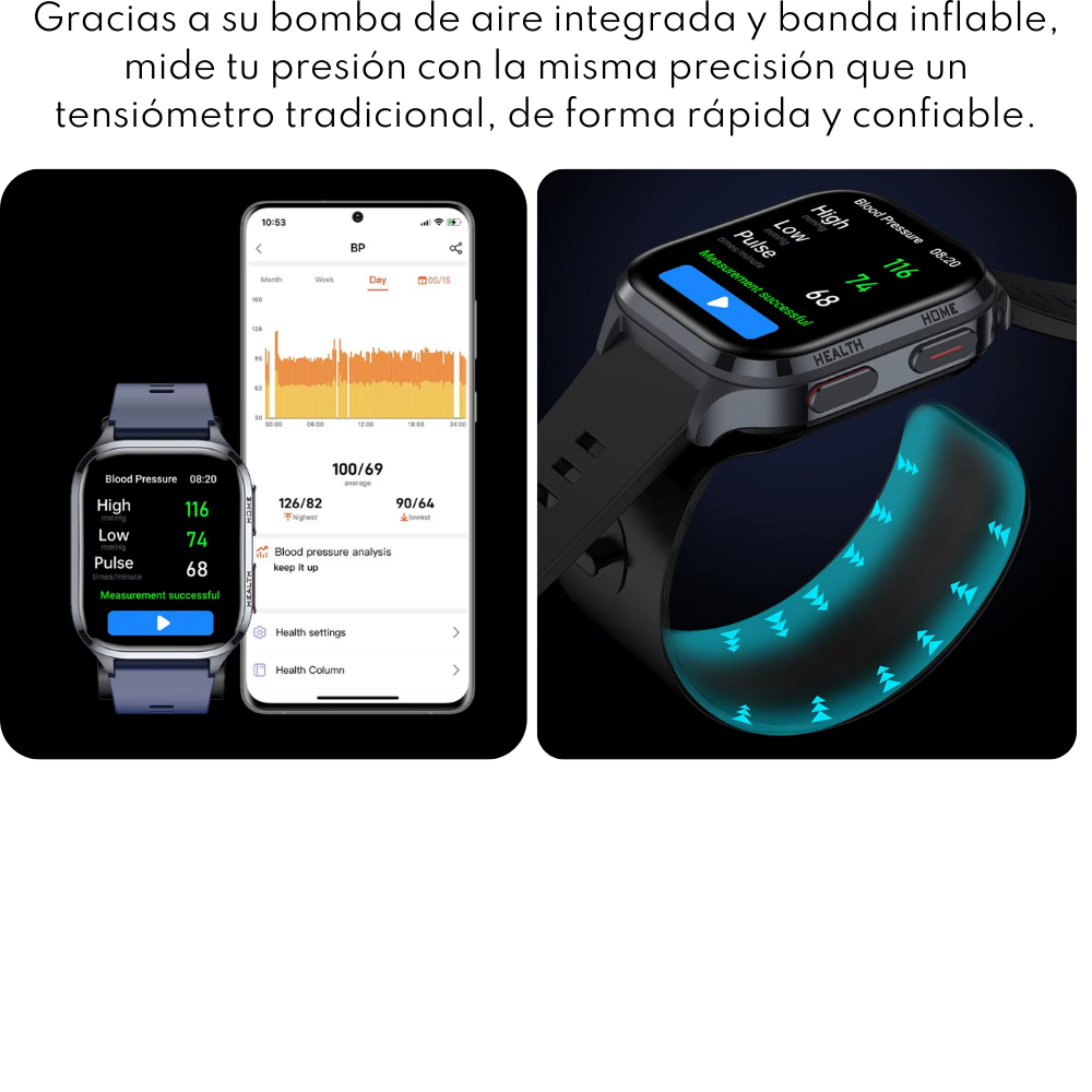 - Presión arterial: El producto cuenta con una bomba de aire en la malla permitiendo conseguir una medición mucho más avanzada y precisa que la de los relojes comunes. Obteniendo así un nivel de exactitud similar al de un tensiómetro tradicional.