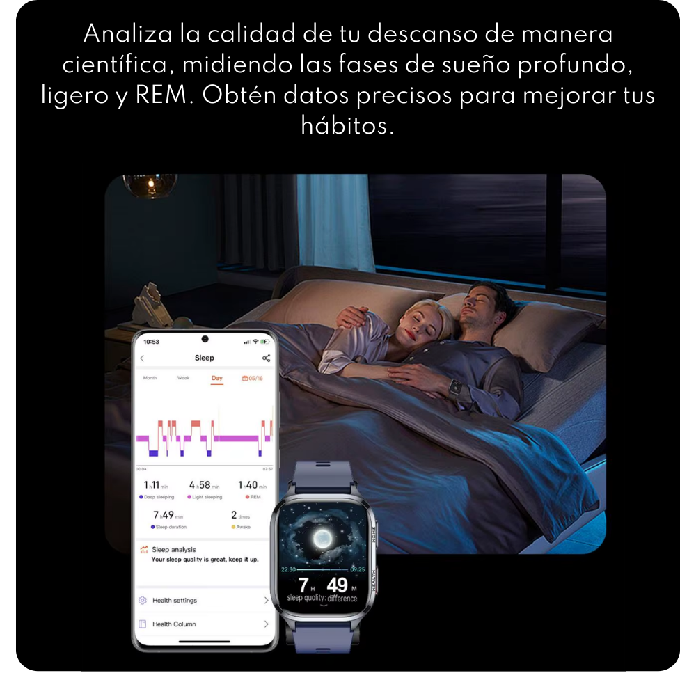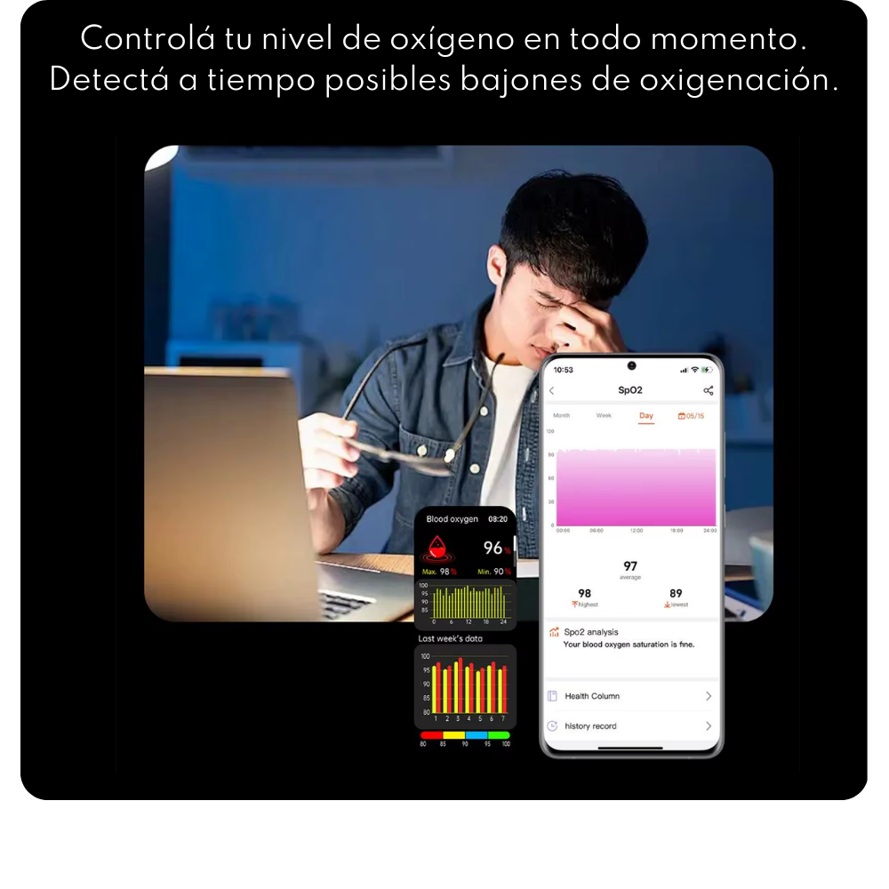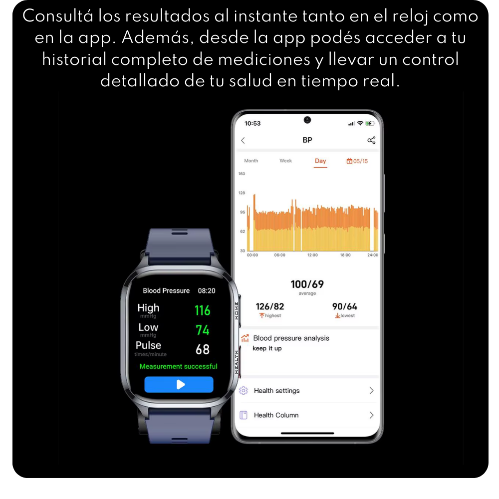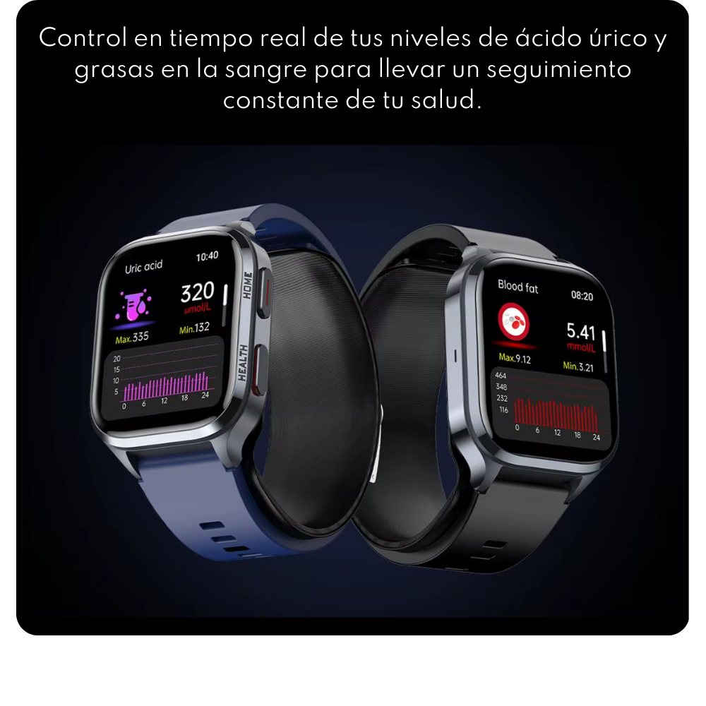 - Presión arterial: El producto cuenta con una bomba de aire en la malla permitiendo conseguir una medición mucho más avanzada y precisa que la de los relojes comunes. Obteniendo así un nivel de exactitud similar al de un tensiómetro tradicional.